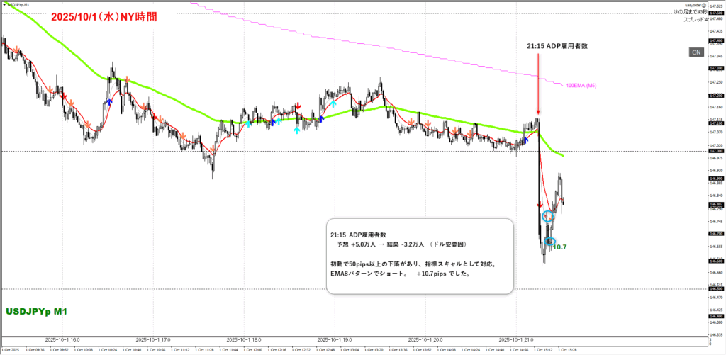 トレード記録(2025/10/01)ADP雇用者数の悪化で急落 → 指標スキャルEMA8ショート勝ち