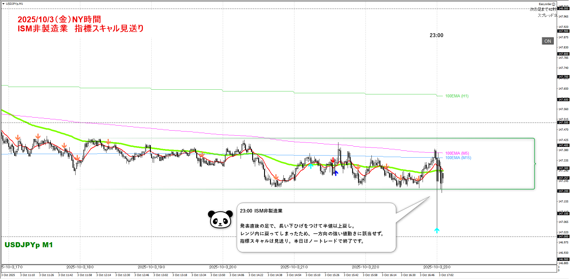 トレード記録(2025/10/3)ISM発表直後に半値戻し → 戦略的見送りでA分類ノートレード