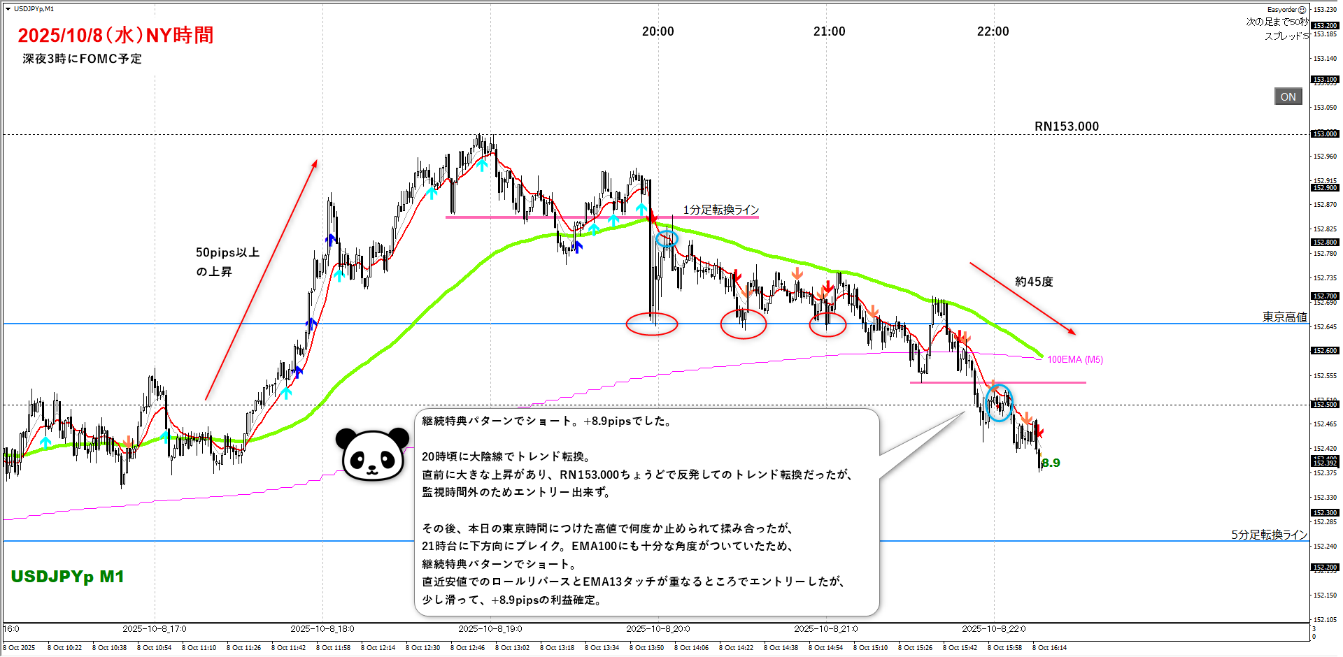 トレード記録(2025/10/8)継続特典パターンでショート +8.9pips → A分類勝ち