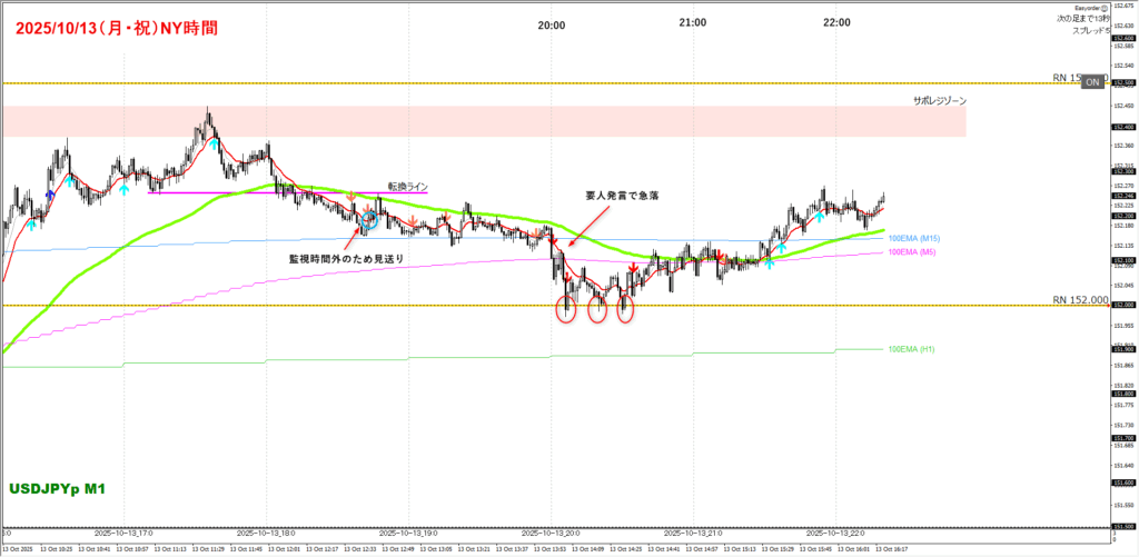 M1・M5ともにRN152.00を軸とした73pipsレンジ構造。20時台の要人発言による下落は一瞬で反転し、続く21時台も実体の短い往復。